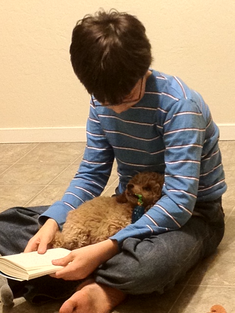 Reading time with a chewy. Thor’s little tic, tac, Táo.