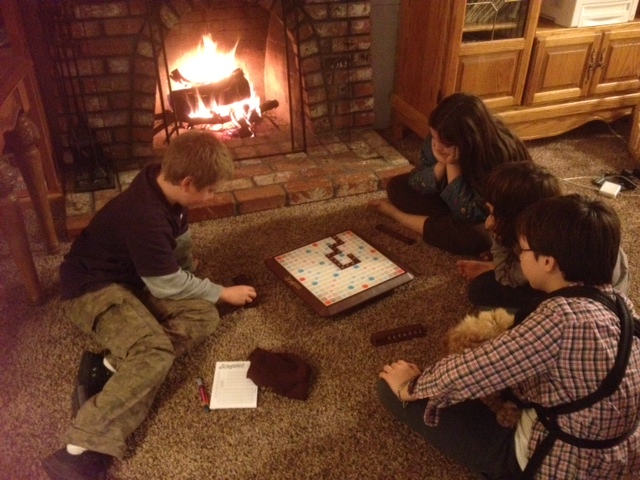 Táo at home playing Scrabble with some of Thor’s friends in her front pack carrier. SHE LOVES IT! You can see how comfy Thor is too!